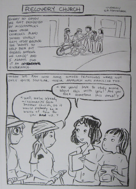 This week has been CRAZY busy because, you guessed it, I got transferred! My new area is called Kichijoji. It's just one area over from the mission home in Tokyo prefecture, and it is the BIG CITY! It's been so fun. My companion is Facer Shimai, my senpai (a missionary 1 transfer older than you) who I got to know in the MTC. She is blonde and Barbie-doll gorgeous, so I bet it's going to be fun proselyting with her! The other big news is that we have four sisters in our apartment---two sisters from the countryside got transferred into our zone without an apartment, so they have to stay here and bike 20 minutes into it every day. Yikes. The new apartment is TINY! In the room we sleep in, all our futons overlap, and maneuvering around the kitchen and bathroom is tricky. It's been fun though. The other two girls are Facer Shimai's doki (missionary on the same transfer) and a 2nd transfer missionary she's training. We're all American and all young missionaries (even though I'm like, halfway done now; that's so weird) so this transfer is going to be wild. So far I haven't met much of the ward or investigators, but I'm really looking forward to it. Leaving all my friends in Matsudo was tough! But you'll get to read all about that in my journal. Speaking of which...sorry, I have absolutely no pages to send this week because I was way too busy with transfers to even draw in it. Next week I should have some.